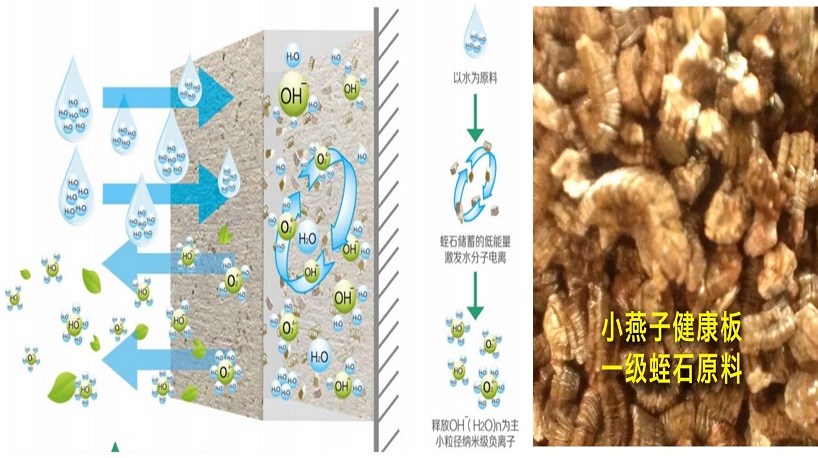 小燕子负离子健康板主要原料是竹木纤维、原生钙粉、一级膨胀蛭石,大量一级膨化蛭石是高绝缘的层状云母片组成的电容器结构,能够大量吸附空气中的电荷,逐渐堆积的电荷碰到水分子以后,能在层状云母片边缘产生放电电离效应,能将板内和空气中的水电离产生空气负离子。
